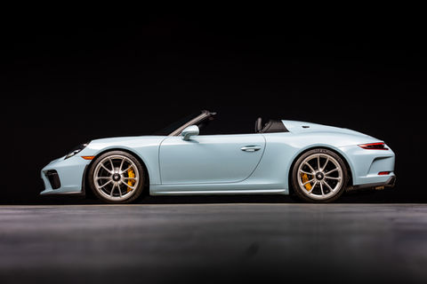The 2019 911 Speedster is the limited-run (1,948 units) swan song of the 991 generation — a purist, open-top GT car that blends Porsche heritage with GT-department hardware. It uses the 500+ hp naturally aspirated 4.0-litre GT3 engine, revving to 9,000 rpm, paired exclusively with a six-speed manual. Weight reduction is central: carbon-fibre front fenders, hood, and signature double-bubble rear deck, a manually operated lightweight top, and pared-back interior with fabric door pulls. The chassis borrows heavily from the GT3, including rear-axle steering, adaptive dampers, PCCB brakes, and center-lock wheels.